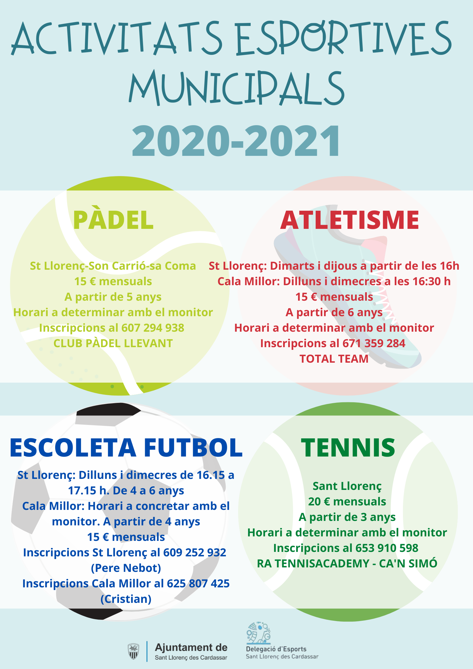 Per això, tots els nines i nines que tinguin entre 3 i 14 anys (2n d’ESO) i que vulguin gaudir de l’esport, iniciarem les activitats, sempre que la realitat i la normativa ho permetin, de pàdel, atletisme, escoleta de futbol i tennis. A més, no descartam que es puguin realitzar altres activitats, tot i que de moment no ho podem confirmar.