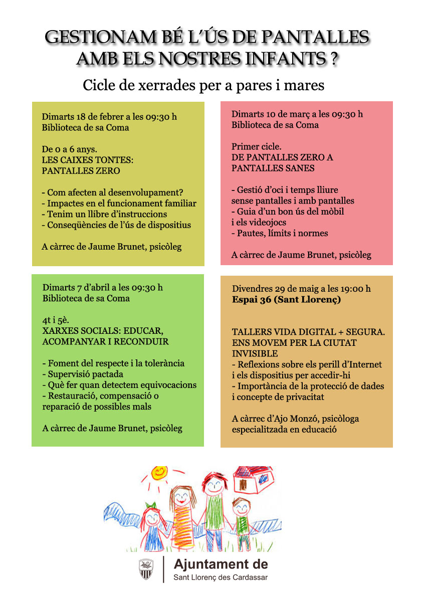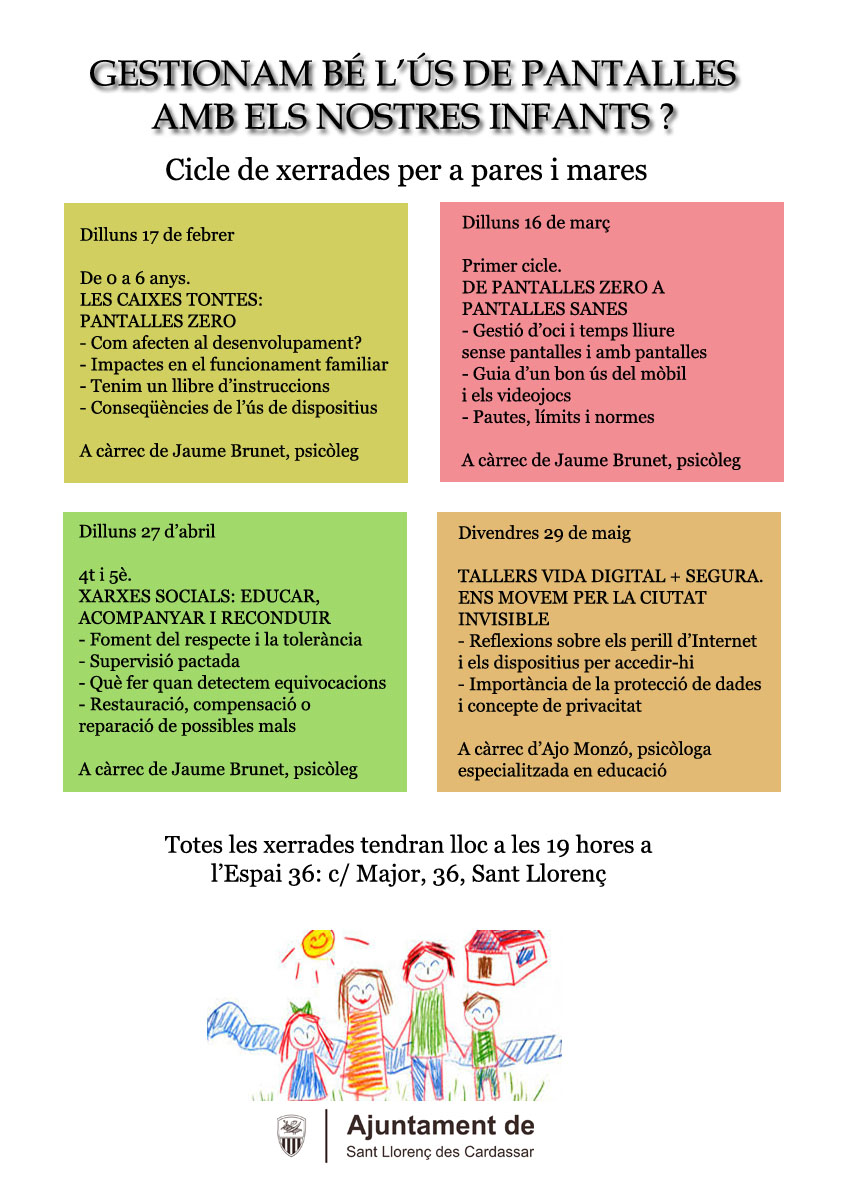 El Departament de Benestar Social ha organitzat un cicle de set xerrades per a pares i mares vinculat a la gestió correcta de l'ús de pantalles amb els infants de diferents edats.